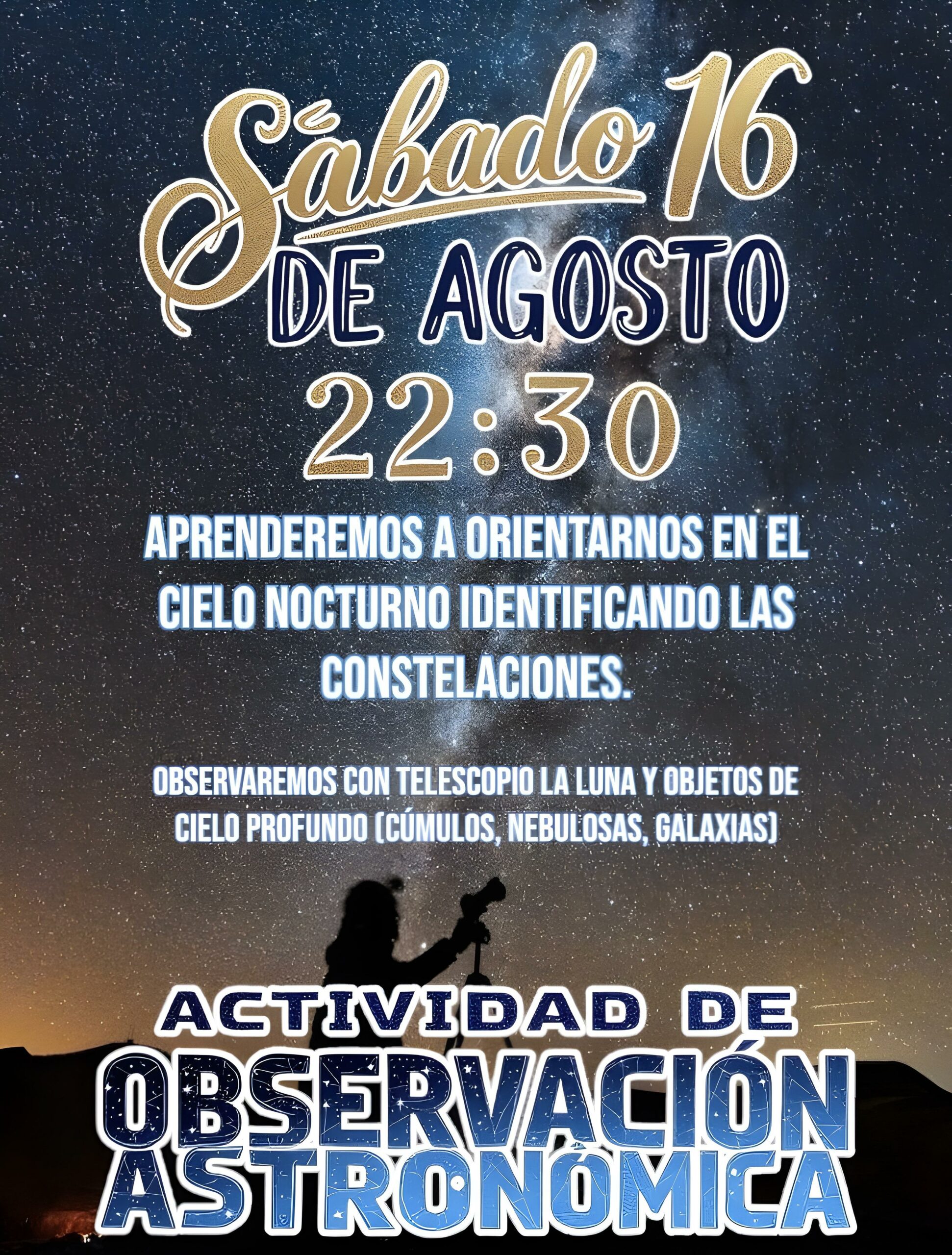 – Observaremos con telescopio la luna y objetos de cielo profundo (cúmulos, nebulosas, galaxias)