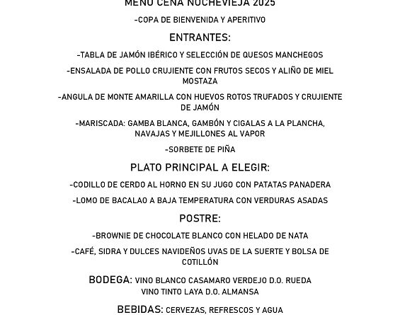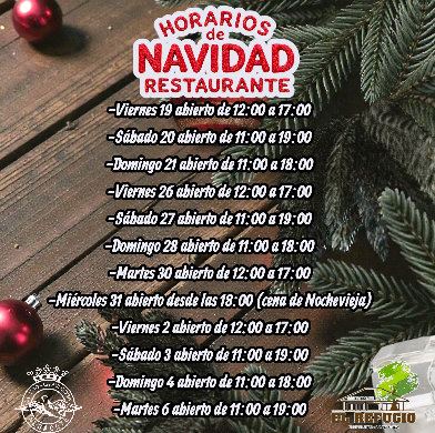 OS INFORMAMOS DE LOS HORARIOS DEL RESTAURANTE DURANTE ESTA NAVIDAD Y APROVECHAMOS PARA RECORDAR QUE QUEDAN ALGUNAS PLAZAS PARA LA CENA DE NOCHEVIEJA CON TRANSPORTE DISPONIBLE TANTO DE IDA COMO DE VUELTA EN HORARIOS A DEMANDA POR LOS ASISTENTES. INTERESADOS 671511500